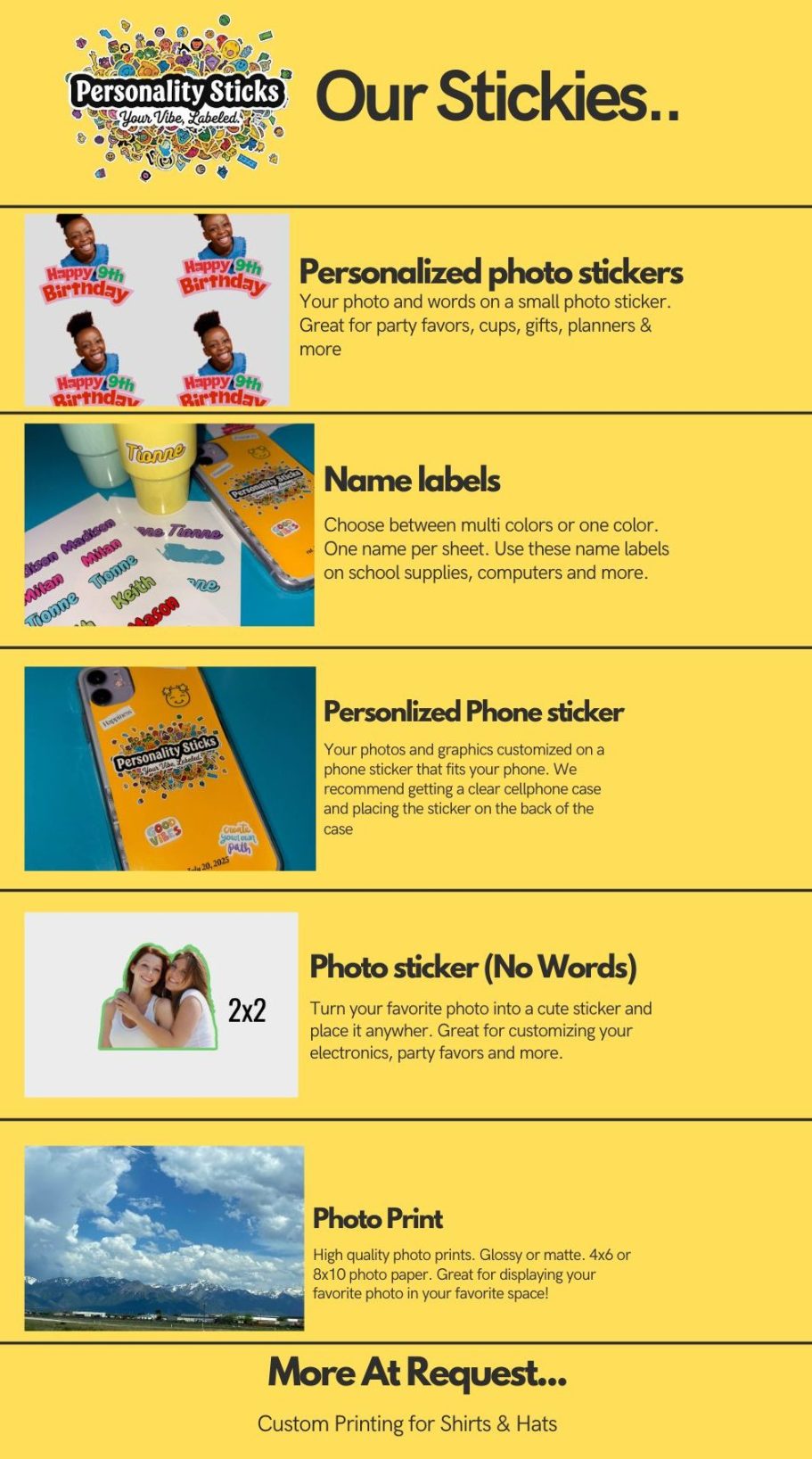 At Personality Sticks, we specialize in turning your ideas into stunning stickers and labels. Photo stickers for party favors or labels for your small business, we can take care of it all.